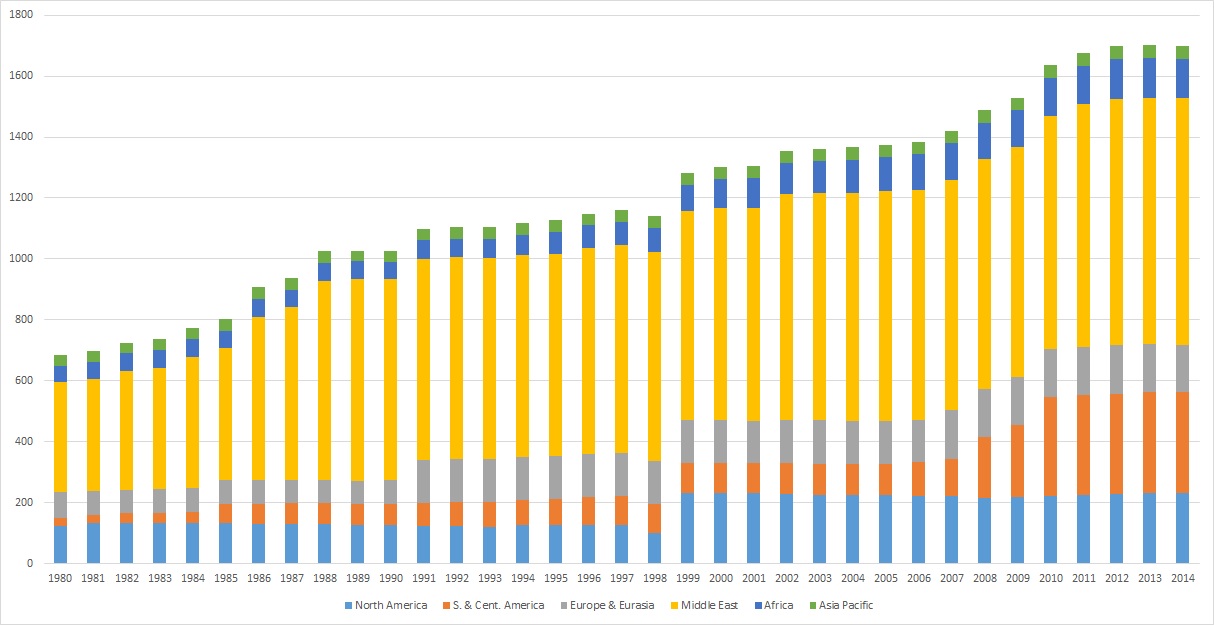 Kretanje rezervi nafte 1980-2014, milijarde barela