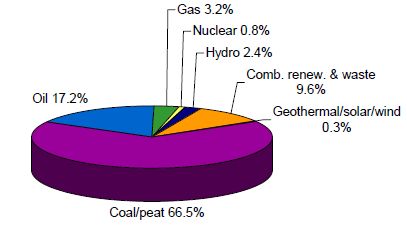 Oil: 17,2%; Gas: 3,2%; Nuclear: 0,8%; Hydro: 2,4%; Comb. renew. & waste: 9,6%; Geothermal/solar/wind: 0,3%; Coal/peat: 66,5%